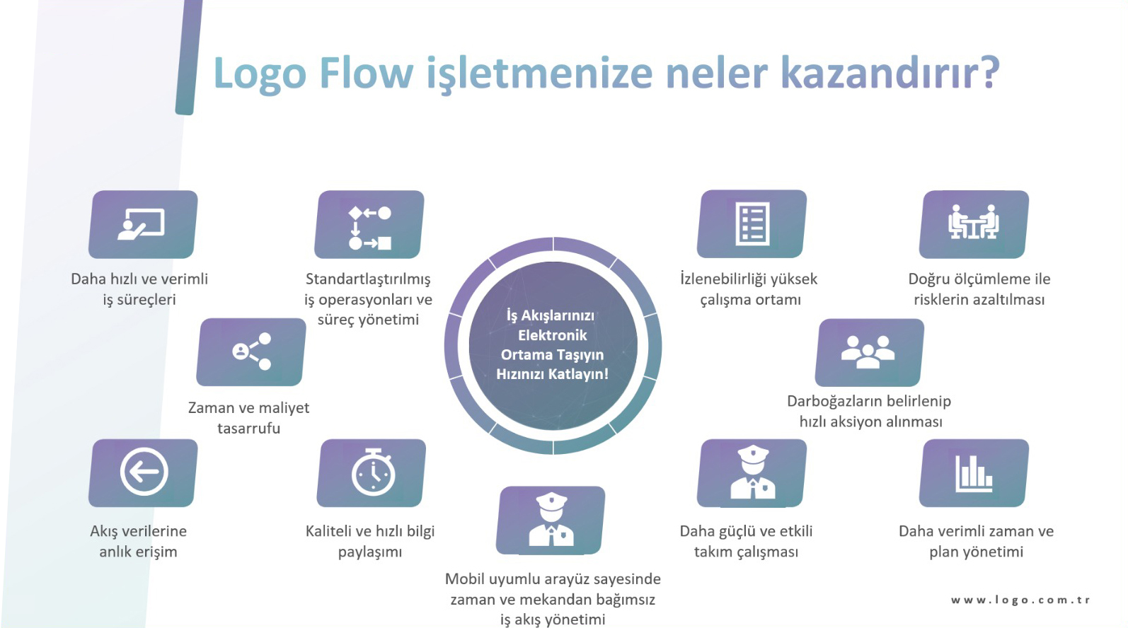 İşlerinizi elektronik ortama taşıyın, işletmenizi güvenle yönetin.Her ölçekten işletmenin farklı noktalarında pek çok farklı iş süreci yürütülüyor.Bu süreçlerin kişilerden bağımsız olarak, doğru ve verimli şekilde sürdürülmesi ve kontrol altında tutulması ise iş verimliliğine önemli katkıda bulunuyor. İş süreçlerinin oluşturulmasını, takip edilmesini ve sonuçlandırılmasını tamamen dijital ortama taşıyan Logo Flow, iş akışlarının daha verimli ve sorunsuz gerçekleşmesini sağlarken; işletme genelinde standardizasyonu artırıyor, maliyetleri ve kayıpları azaltıyor. Kullanıcı dostu tasarımıyla Logo Flow; işlerinizi hızlı, düzenli, kolay ve verimli şekilde yönetebilmenizi kolaylaştırıyor. |