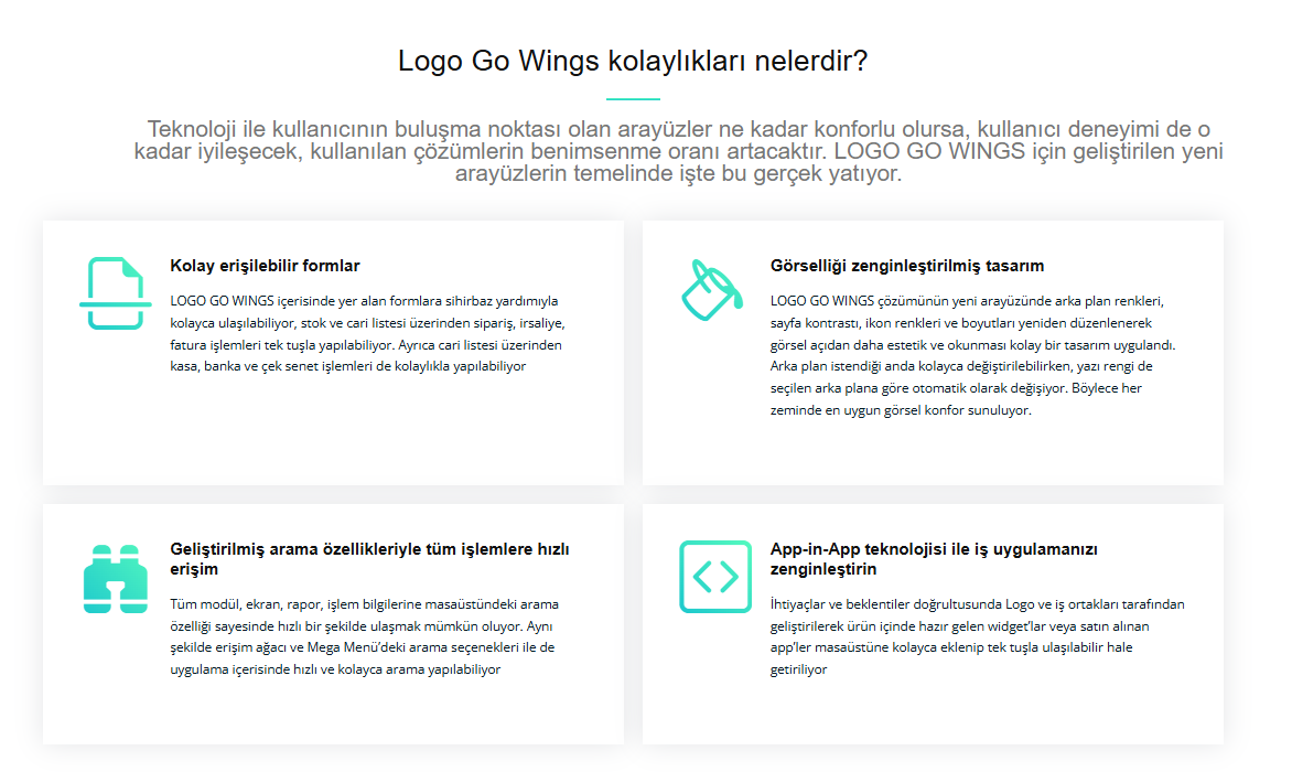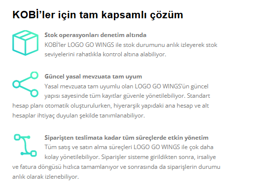 Logo’nun web üzerinden kullanılabilen çözümü ile dijital dönüşümdeki yerinizi alın! Küçük ve orta ölçekli işletmelerin süreçlerini etkili bir şekilde yönetebilmeleri ve rekabet avantajı sağlamaları için muhasebe çözümlerinden fazlası gerekiyor. Web üzerinden kullanılan Logo GO Wings, tüm iş süreçlerini tek noktadan zaman ve mekandan bağımsız uçtan uca yönetmeyi sağlayarak KOBİ’lere destek oluyor. Logo GO Wings kullanıcı dostu arayüzü ile istenen bilgilere kolayca ulaşmayı sağlarken zaman tasarrufu ve verimlilik artışı kazandırıyor.