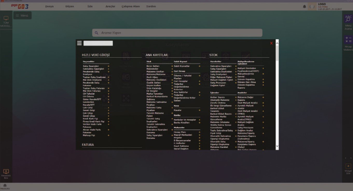 KOBİ’ler için tam kapsamlı çözümİş süreçlerini çok daha kolay, pratik ve düşük maliyetlerle etkin bir şekilde yönetebilmeyi sağlayan LOGO GO WINGS, bir KOBİ’nin müşteri memnuniyeti oluşturmak için ihtiyaç duyduğu tüm fonksiyonları içeriyor. LOGO GO WINGS ile stoktan siparişe, muhasebe kayıtlarından banka verilerine kadar tüm süreçler tek noktadan, tutarlı bir şekilde kontrol edilebiliyor. Böylece zaman ve maliyet tasarrufu sağlanıyor. LOGO GO WINGS, KOBİ’lerin ihtiyaçlarına göre hazırlanmış birçok standart fonksiyonun yanı sıra, işletmenize özel çözümleri de bulabileceğiniz app ve widget’larla da zenginleştirilebiliyor. Böylece tüm KOBİ’ler, kendileri için en uygun LOGO GO WINGS paketini oluşturabiliyor. |