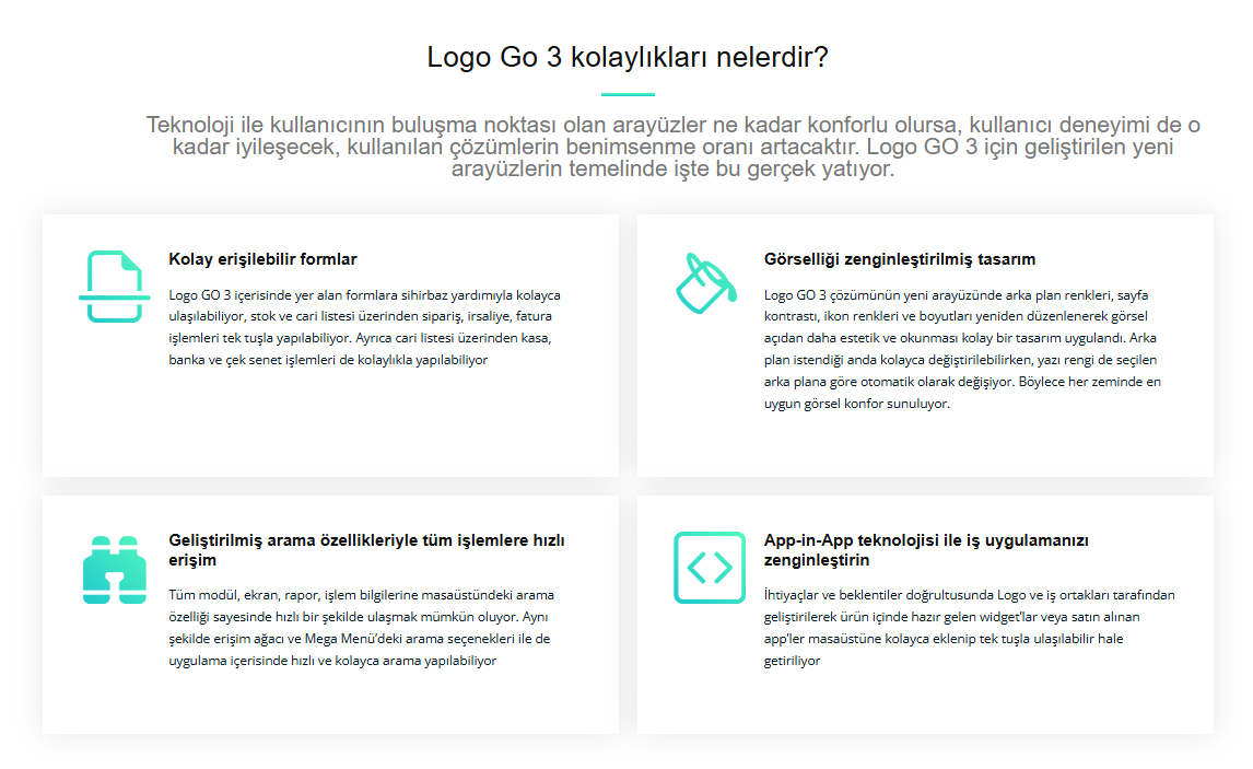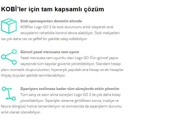 KOBİ’ler için tam kapsamlı çözümİş süreçlerini çok daha kolay, pratik ve düşük maliyetlerle etkin bir şekilde yönetebilmeyi sağlayan Logo GO 3, bir KOBİ’nin müşteri memnuniyeti oluşturmak için ihtiyaç duyduğu tüm fonksiyonları içeriyor. Logo GO 3 ile stoktan siparişe, muhasebe kayıtlarından banka verilerine kadar tüm süreçler tek noktadan, tutarlı bir şekilde kontrol edilebiliyor. Böylece zaman ve maliyet tasarrufu sağlanıyor. Logo GO 3, KOBİ’lerin ihtiyaçlarına göre hazırlanmış birçok standart fonksiyonun yanı sıra, işletmenize özel çözümleri de bulabileceğiniz app ve widget’larla da zenginleştirilebiliyor. Böylece tüm KOBİ’ler, kendileri için en uygun Logo GO 3 paketini oluşturabiliyor. |