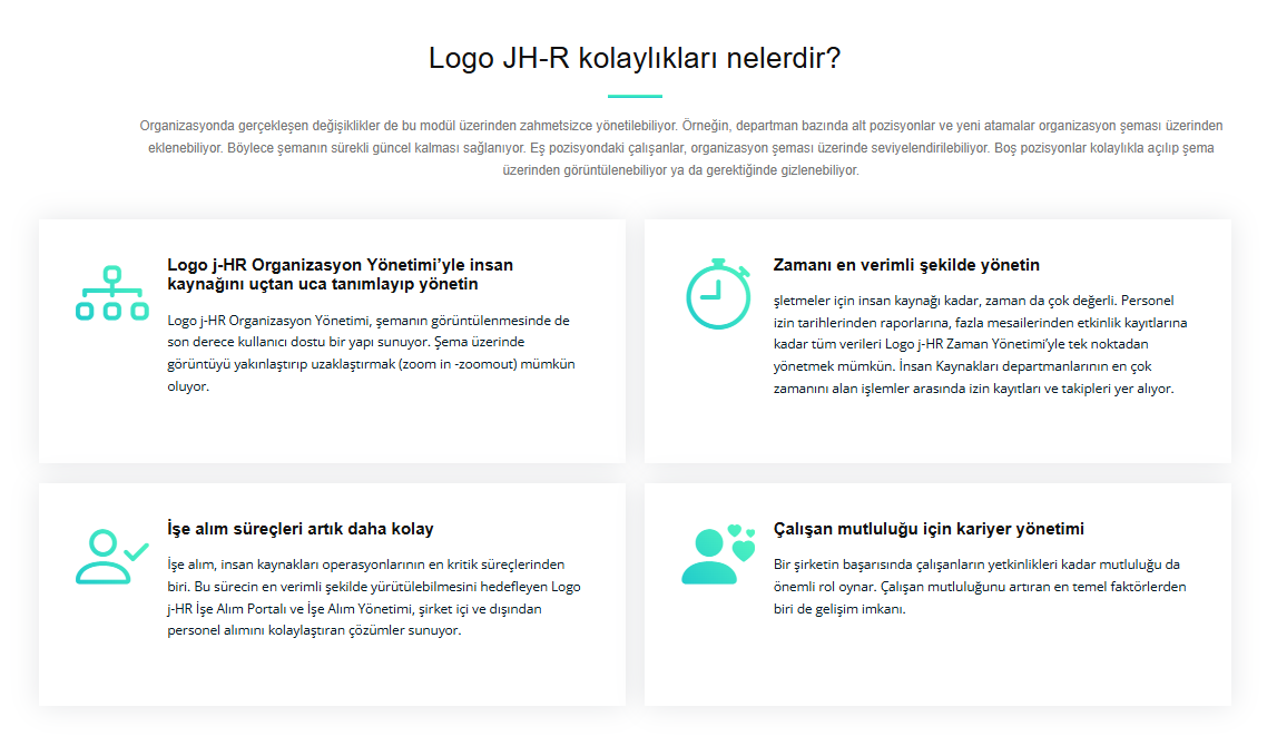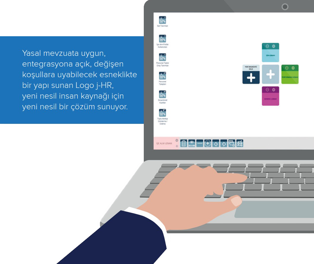 Web tabanlı yapı sayesinde İK süreçlerine her an, her yerden erişebilmek isteyenler Logo’nun yeni nesil İK yönetimi çözümü Logo j-HR’ı tercih ediyor. Zamandan ve mekandan bağımsız çalışma imkanı sunan Logo j-HR, İK ekiplerine ve yöneticilerine ihtiyaç duydukları esnekliği ve hızı kazandırıyor. Özel onay mekanizmaları, Logo markalı ya da bağımsız çözümlerle entegrasyon imkanı ve yasal mevzuata tam uyumluluk sağlayan özellikleriyle Logo j-HR, İK’da yeni nesil yönetimin yeni adı oluyor!