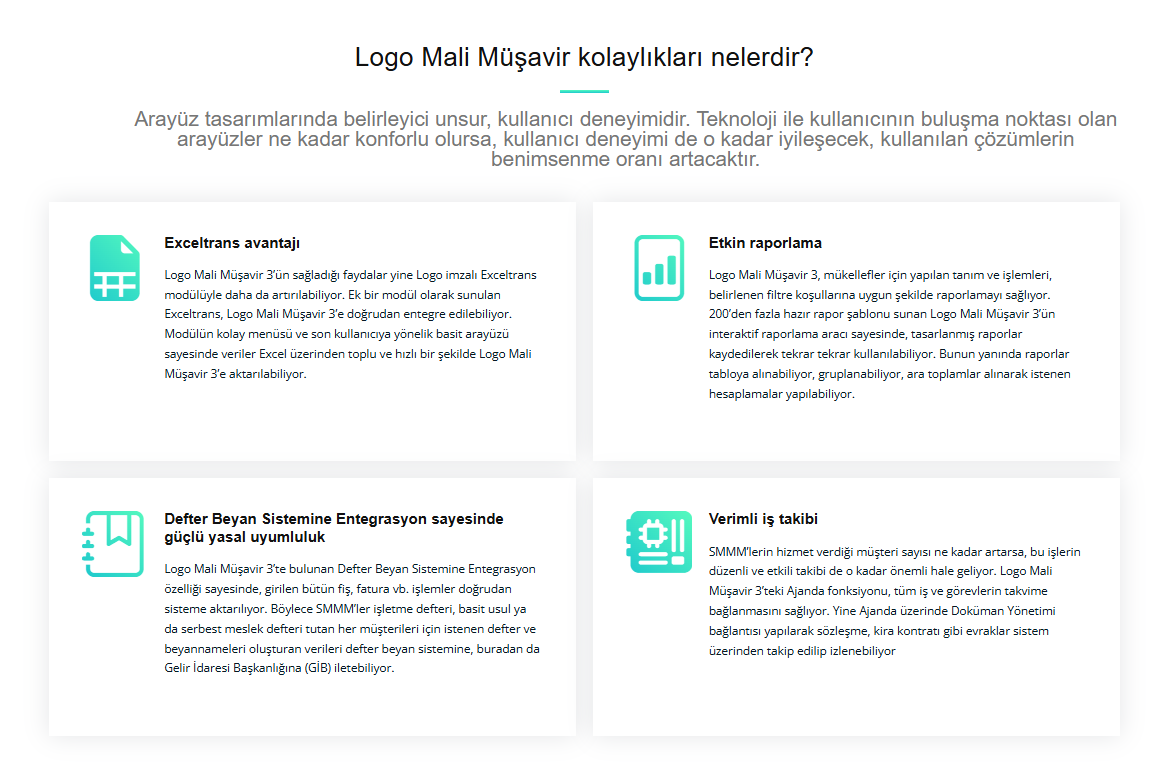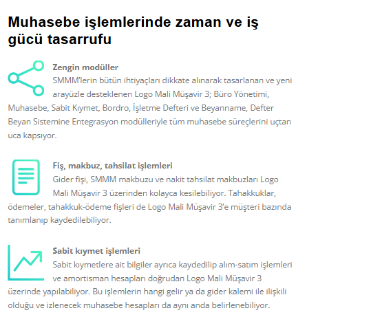 Müşavirlik hizmetlerinde iş yükünüzü Logo Mali Müşavir 3’e devredin, zaman kazanın!Mali Müşavirlerin ihtiyaç duydukları tüm özellikleri içeren Logo Mali Müşavir 3 çözümü büro yönetimi, bordro ve muhasebe işlemlerini bünyesinde barındırıyor. Bu çözüm sayesinde hem Serbest Muhasebeci Mali Müşavir (SMMM) müşterilerinin muhasebe süreçleri usule uygun ve hızlı bir şekilde yönetilmiş oluyor hem de bizzat SMMM’lerin iş yükü azalıyor Logo Mali Müşavir 3’te sunulan muhasebe ve yönetim süreçlerinden daha fazlasını isteyen SMMM’ler ise Logo GO 3 kurumsal kaynak planlama çözümünü de bu yapıya entegre ederek stoktan siparişe, muhasebe kayıtlarından banka verilerine kadar tüm iş süreçlerini tek noktadan etkin bir şekilde yönetebiliyor. Mali Müşavirler hem hizmet verdikleri müşterilerinin hem de kendi işletmelerinin tüm muhasebe süreçlerini yönetirken zaman ve iş yükü açısından desteğe ihtiyaç duyuyor. Logo Mali Müşavir 3 yepyeni özellikleri ve arayüzüyle mali müşavirlere bu desteği sağlarken aynı zamanda da maliyet tasarrufu kazandırıyor, mevzuat takibini kolaylaştırıyor, Gelir İdaresi Başkanlığı ile doğrudan iletişim imkanı sunuyor. |