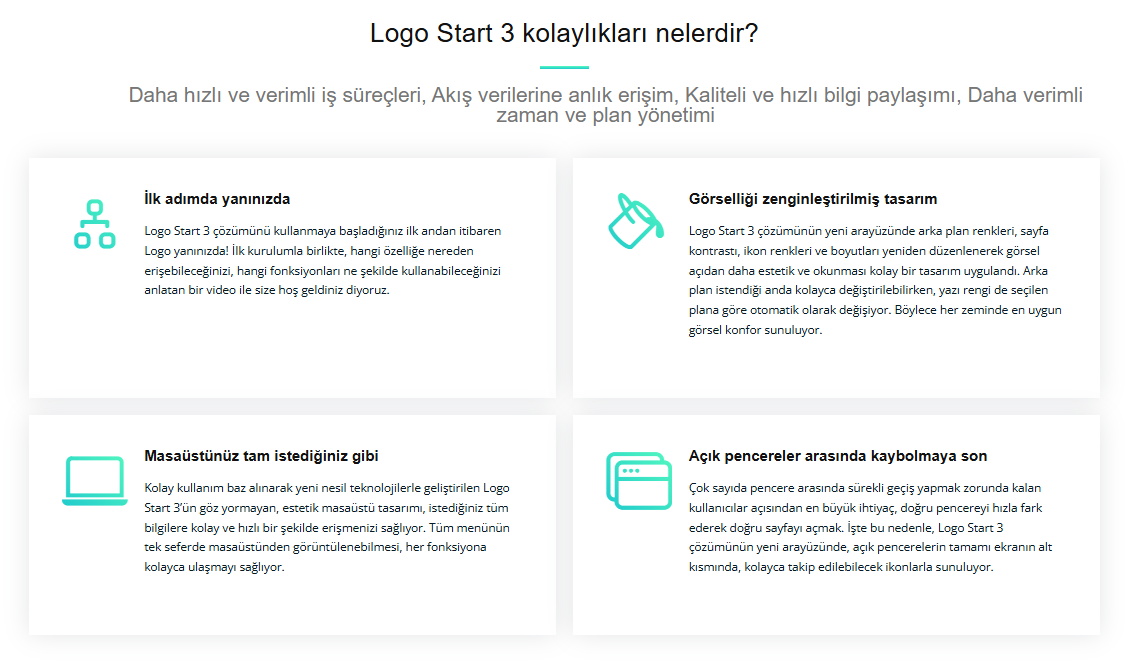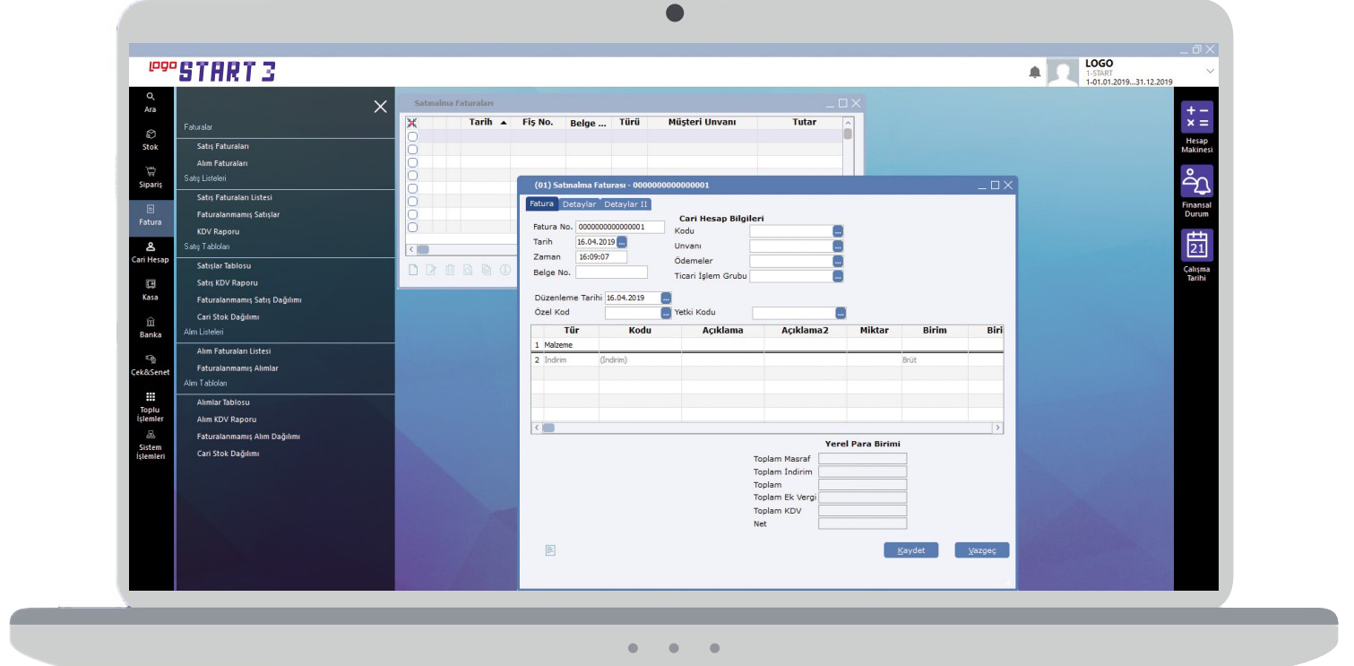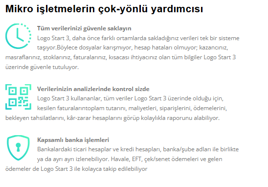 Logo Start 3 ile entegre çözümlerimize-Çözümler:Gelir idaresi Başkanlığı’nın belirlediği standartlara uygun olarak geliştirilen Logo e-Çözümler; e-Fatura, e-Arşiv Fatura, e-Defter ve e-İrsaliye gibi pek çok farklı uygulamayı içeriyor. Logo e-Çözümler sayesinde işletmeler kâğıt, baskı, arşivleme ve iş gücü maliyetlerini düşürüyor; operasyonel yükü azaltıyor; finansal süreçleri hızlandırıyor. Aynı zamanda e-Mutabakat ve e-Ekstre gibi katma değerli çözümler, Yapay Zeka ve ve Nesnelerin İnterneti tabanlı inovatif uygulamalar ile dijital dönüşüm yolculuğunuza uçtan uca rehberlik ediyor **Logo Start 3 sadece e-Fatura ve e-Arşiv Fatura entegrasyonları ile birlikte sunulmaktadır |