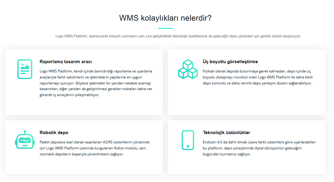 Depo süreçlerinde Logo WMS Platform kullanan işletmeler malzeme, bilgi ve para akışını entegre yönetiyor. Böylece depo süreçlerinde iyileşme sağlanıyor ve doğru ürün, doğru zamanda, doğru yerde ve doğru fiyatla sunulabiliyor. Bu da hizmet kalitesinin ve müşteri memnuniyetinin artmasını sağlamaktadır.