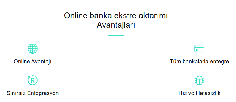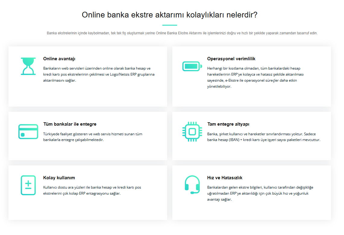 Zaman ve iş gücü tasarrufuBankaların web servisleri üzerinden online olarak banka hesap ekstrelerinin çekilmesi ve Logo/Netsis ERP gruplarına aktarılmasını sağlar. Bankalardan gelen bu ekstrelerinin Logo'ya gelen havale fişi, gönderilen havale fişi, banka işlem fişi, banka virman fişi, bankaya yatırılan/çekilen kasa fişi, bankadan çek/senet ödemesi, bankadan çek/senet tahsilatı, banka alınan/verilen hizmet faturası ve mahsup fişi olarak aktarılmasını sağlar. Netsis tarafinda dekont olarak aktarımlar gerçekleştirilir. |